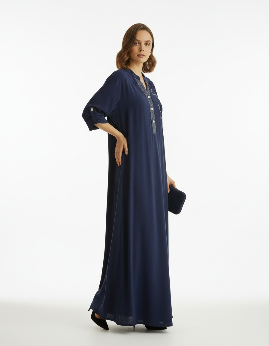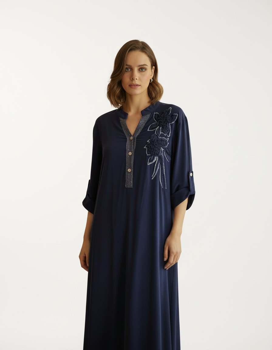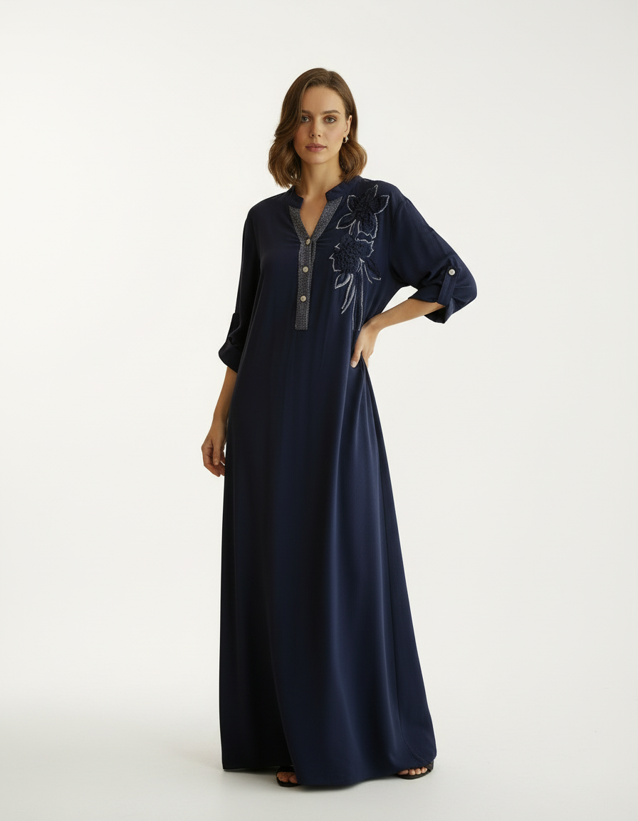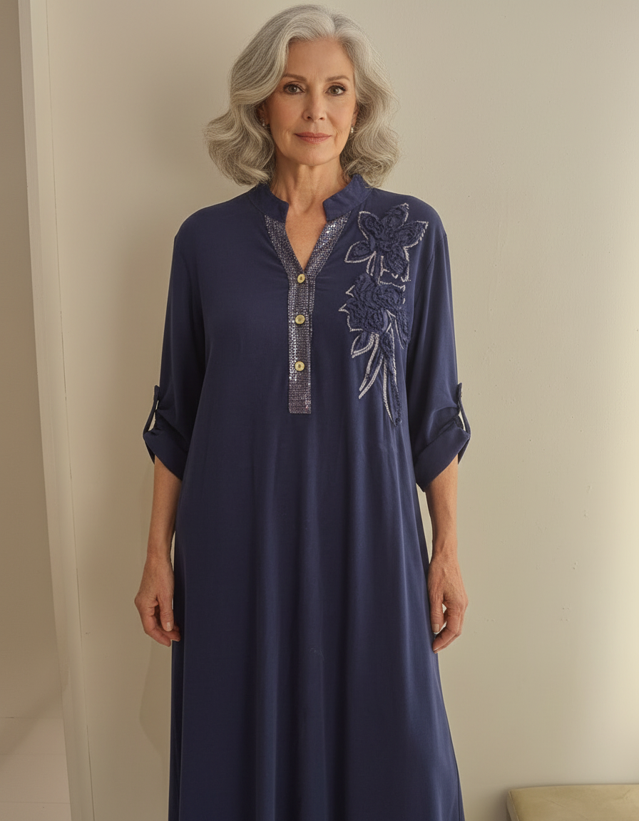 Oplev tidløs elegance med denne eksklusive italienske fløjlskjole i dyb blå nuance. Fremstillet i luksuriøst fløjl, der omfavner kroppen med en blød, silkeagtig finish.